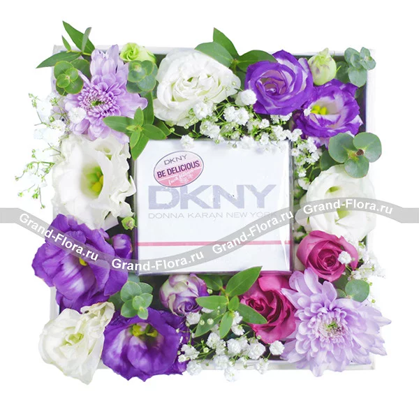 Стандартный: эустома фиолетовая -1 шт., эустома белая - 1 шт., хризантема фиолетовая кустовая - 1 шт.,роза розовая - 2 шт., эвкалипт, зелень, гипсофила., парфюм DKNY "Be Delicious Fresh Blossom EDP" - 30 ml., оазис, коробка.